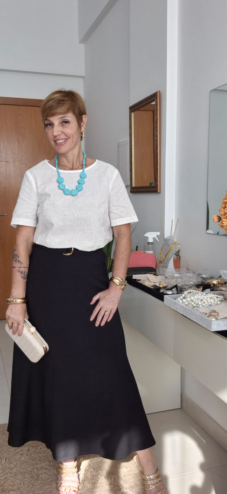 BLUSA ALFAIATARIA LISA COM MANGAS E DECOTE REDONDO