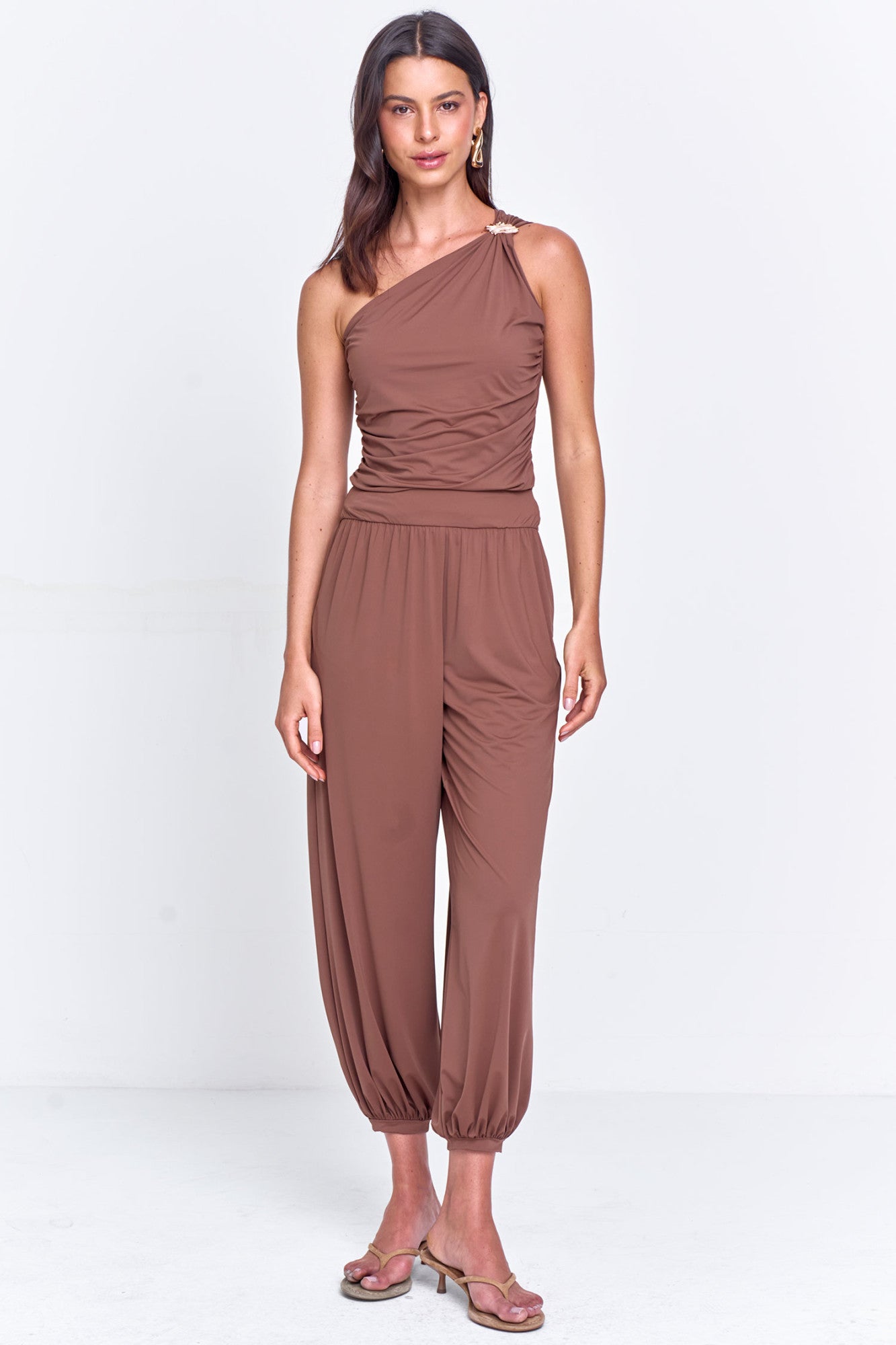 Blusa Malha Um Ombro Só com Detalhe Franzido Marrom