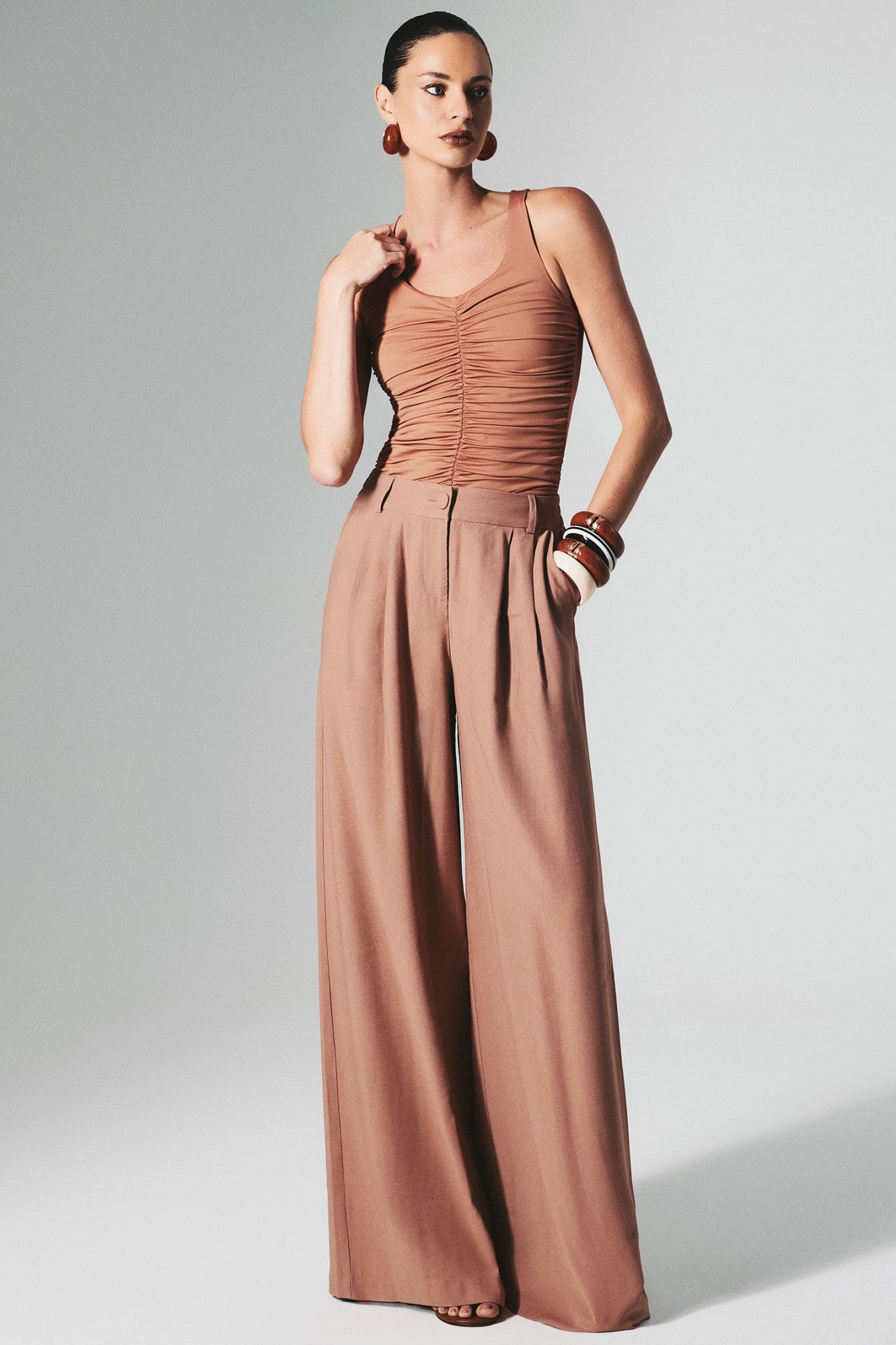 Calça Pantalona de Alfaiataria com Pregas e Bolso Mocha