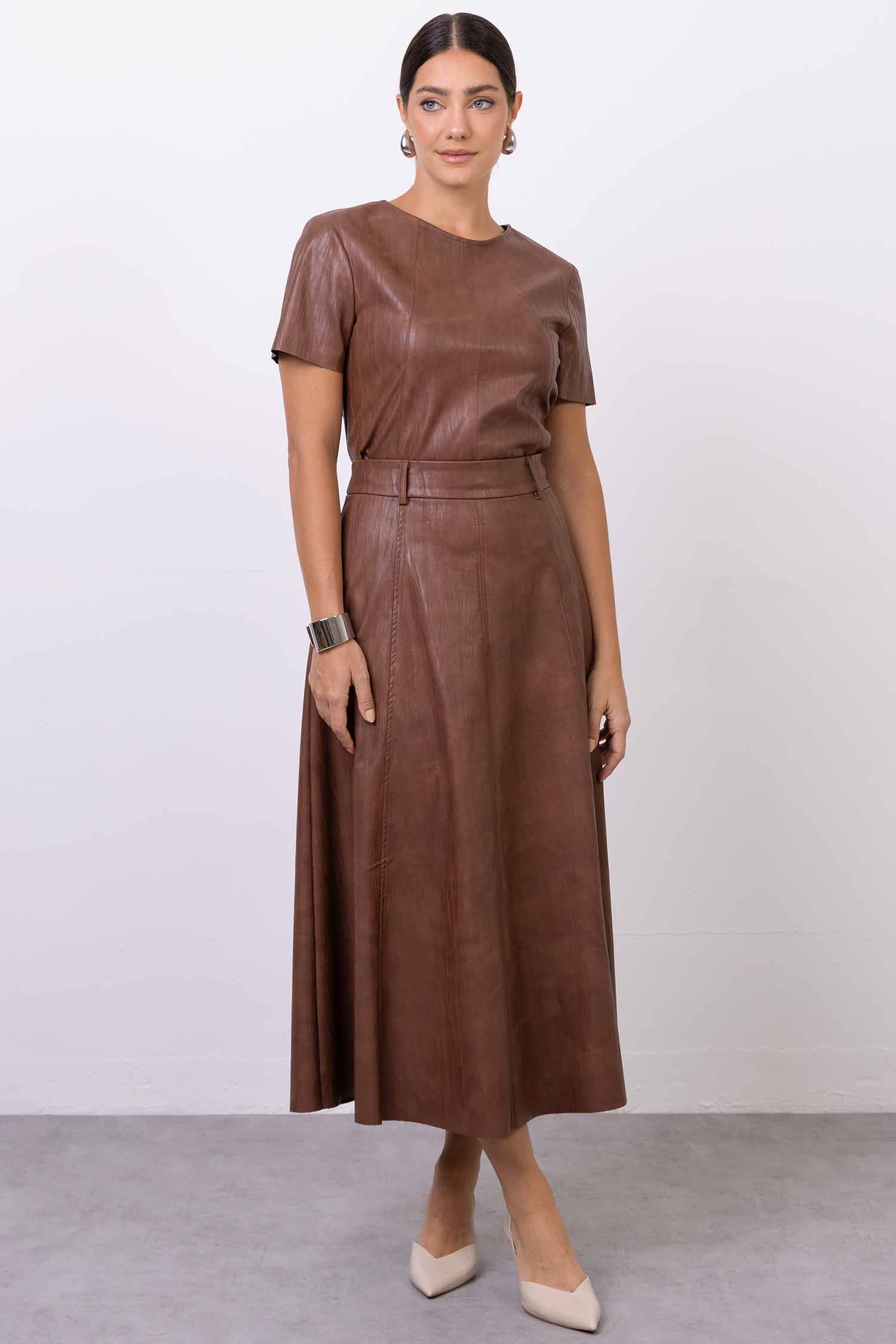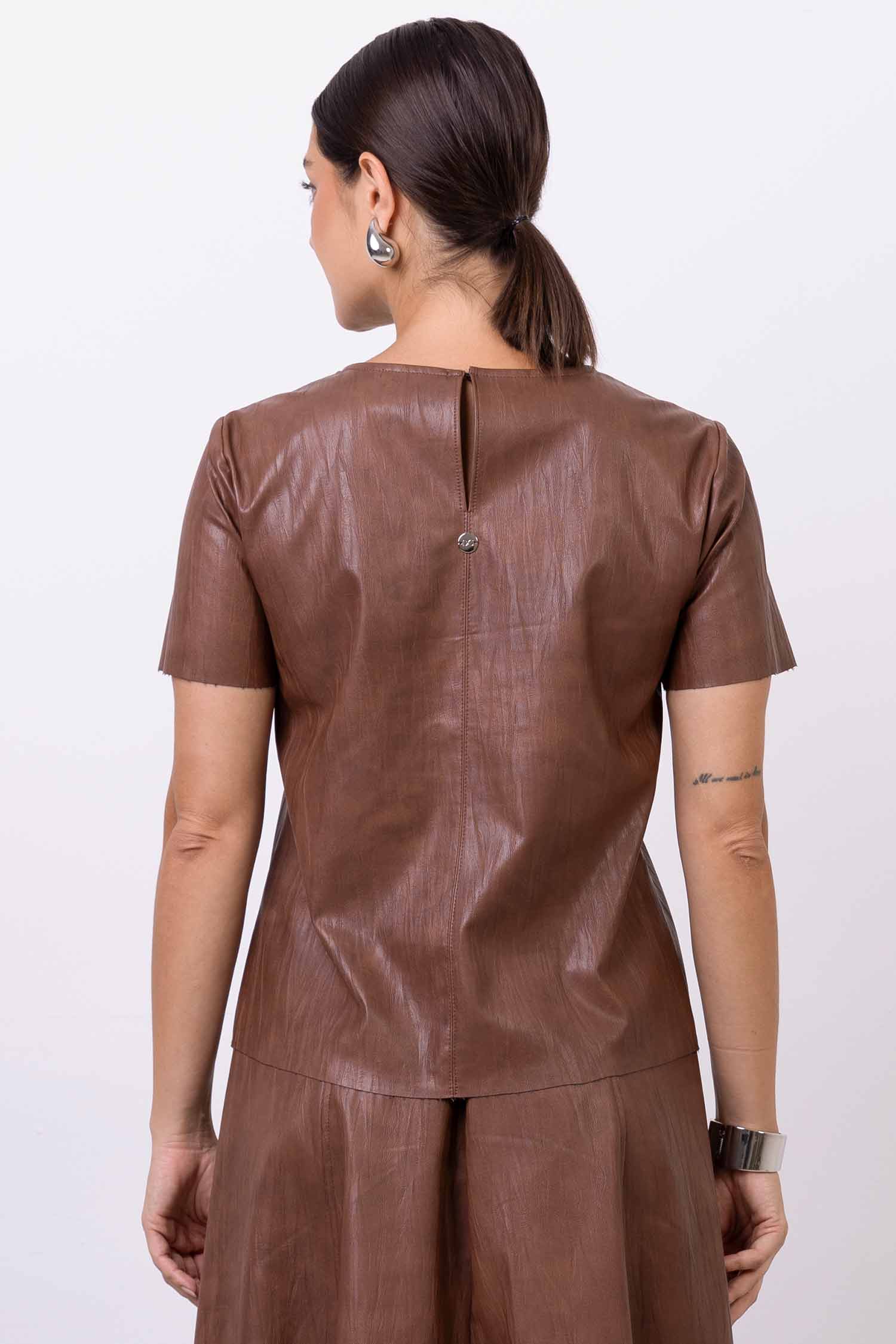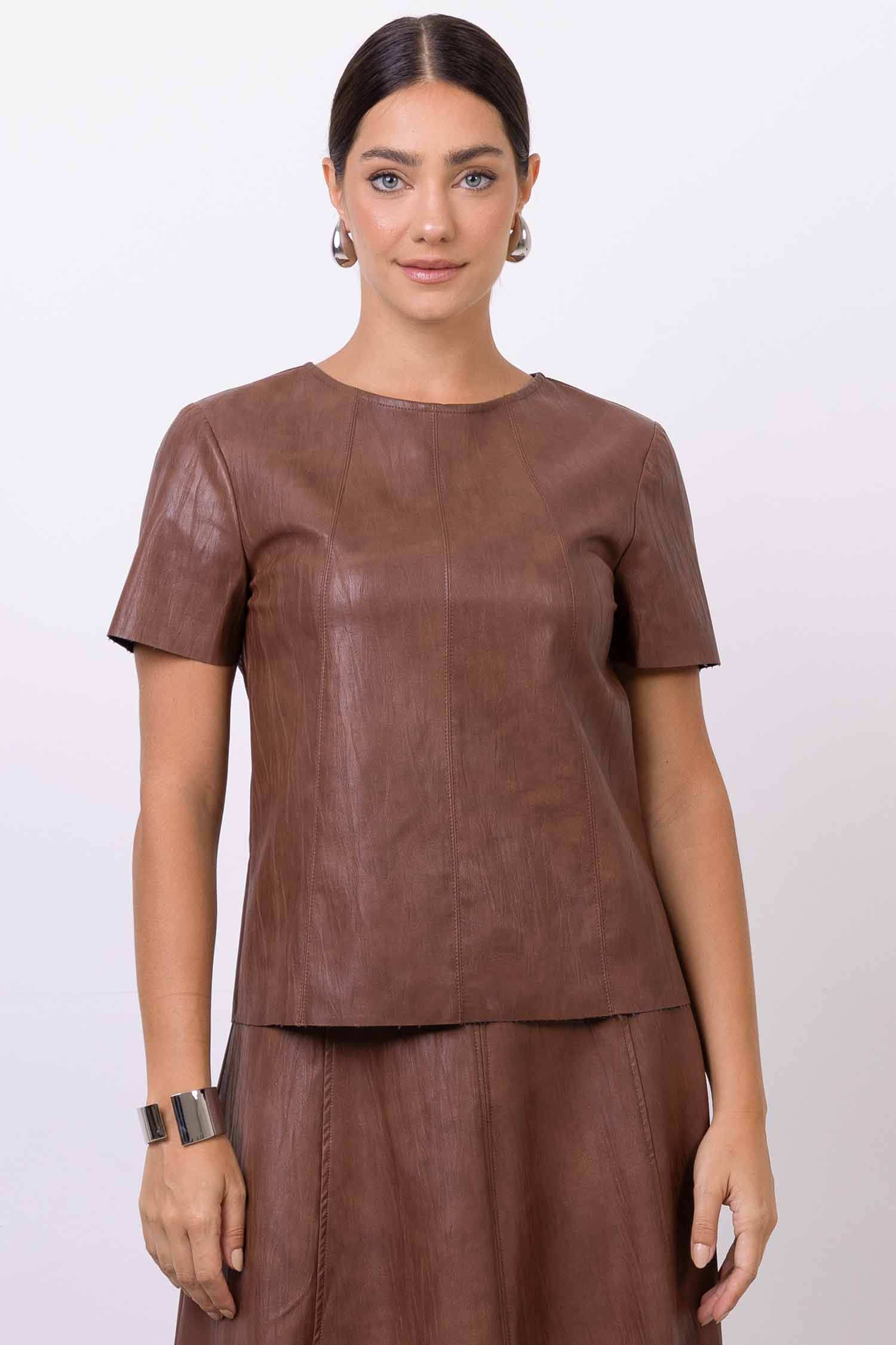 A T-Shirt em couro sintético é uma peça moderna que combina estilo e atitude. Possui recortes estratégicos com pespontos aparentes, adicionando detalhes sofisticados ao design minimalista. Com uma modelagem levemente ajustada, é perfeita para quem busca um visual contemporâneo sem abrir mão do conforto. Ideal para compor looks ousados e elegantes, pode ser combinada com calças de alfaiataria ou jeans para diferentes ocasiões.